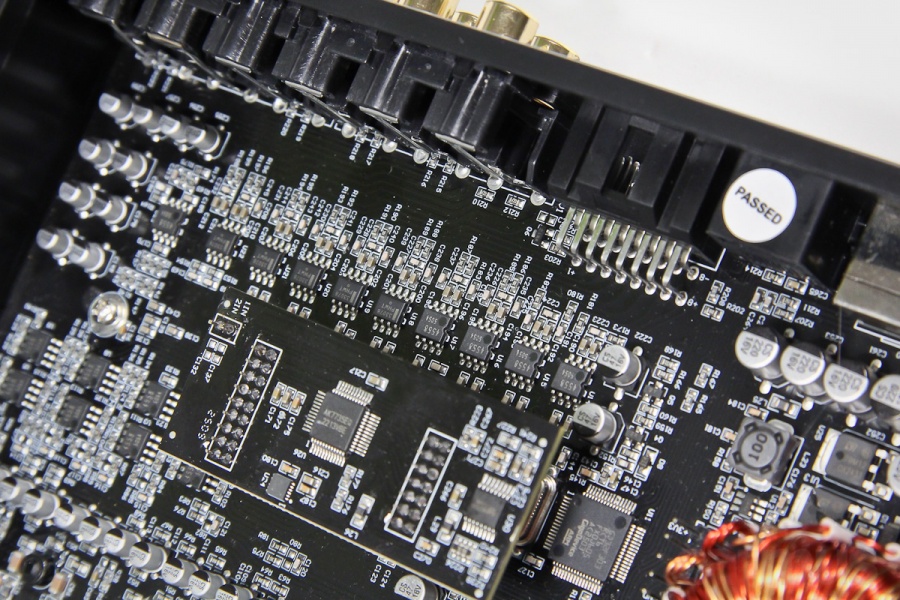 Кстати, коаксиальный вход неожиданно разместился на противоположной стороне от остальных входов, недалеко от выходного разъёма.