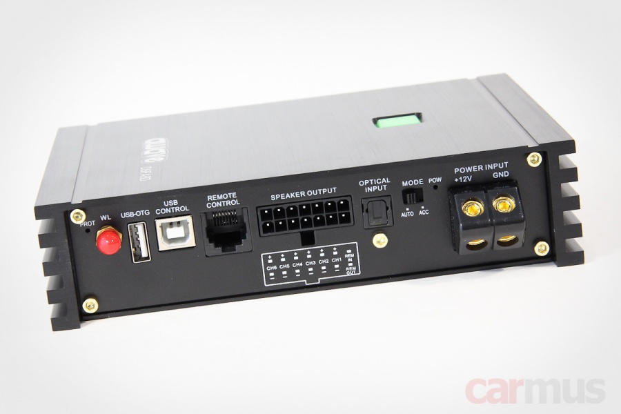 Обычно подобные процессорные усилители построены на «магнитольных» микросхемах АВ класса, здесь же – D-класс с полноценным повышающим блоком питания. Правда, сами чипы скрыты под платой и прижаты к корпусу, поэтому подсмотреть, на чём он собран, не удалось.
