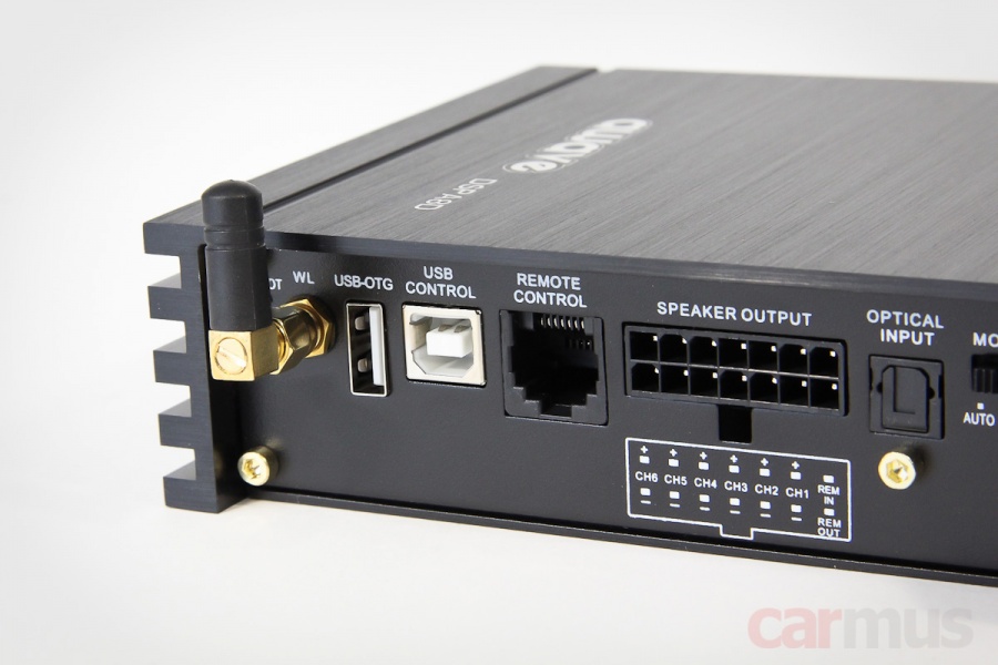 Имея такие возможности работы с источниками, может понадобиться пульт дистанционного управления – разъём для него предусмотрен, но сам пульт идёт как опция и докупается отдельно. Это логично, поскольку если вы подключаетесь, к примеру, к штатке по аналогу или, скажем, к ГУ Android по оптике, которое само умеет «рулить» громкостью «в цифре», то пульт просто не нужен, и на нём можно сэкономить.
