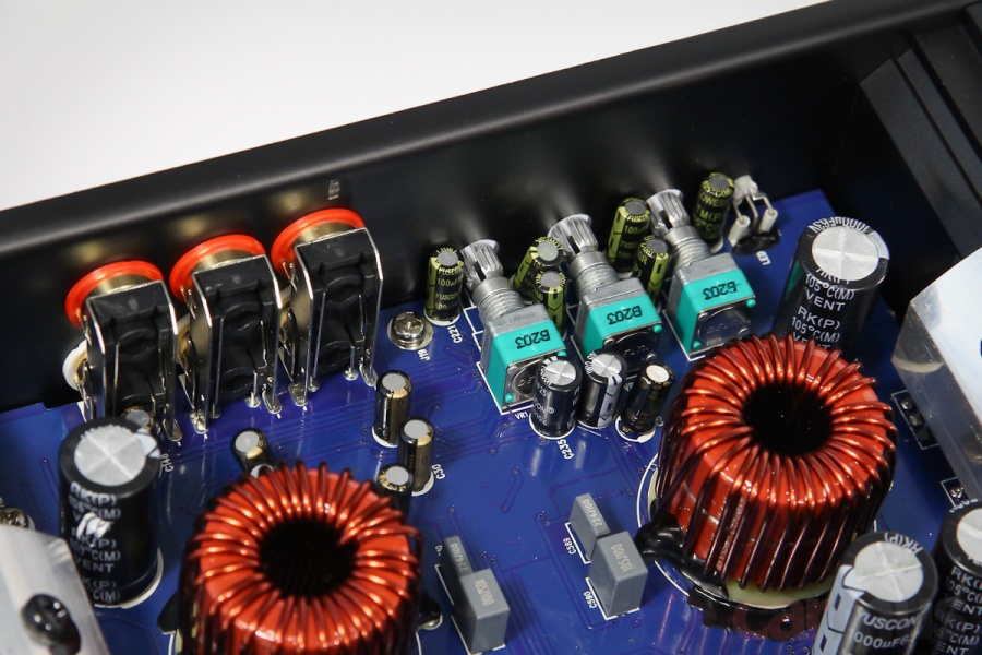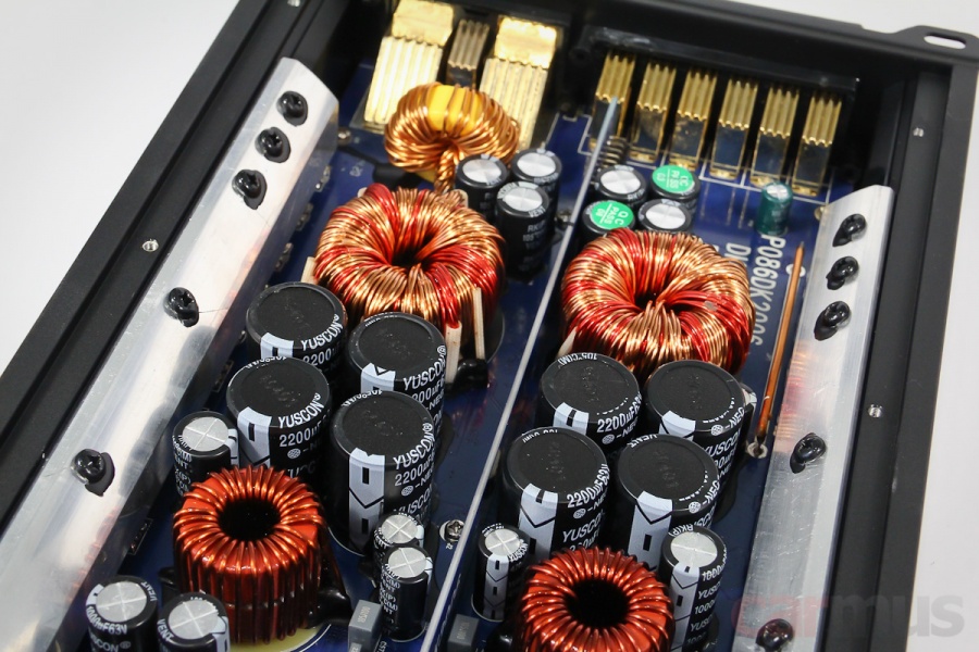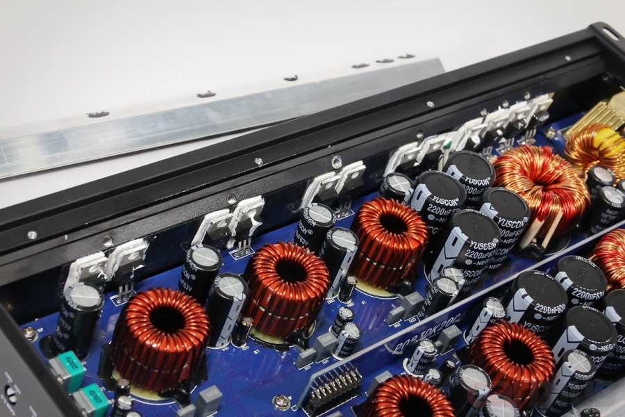 Теперь начинка. Тут тоже многое говорит об акценте на мощности – двойной блок питания, относительно крупные выходные дроссели. Вот только узнать что-нибудь конкретное по элементному составу, не разбирая усилитель полностью, оказалось сложно: многие элементы скрыты под платой.