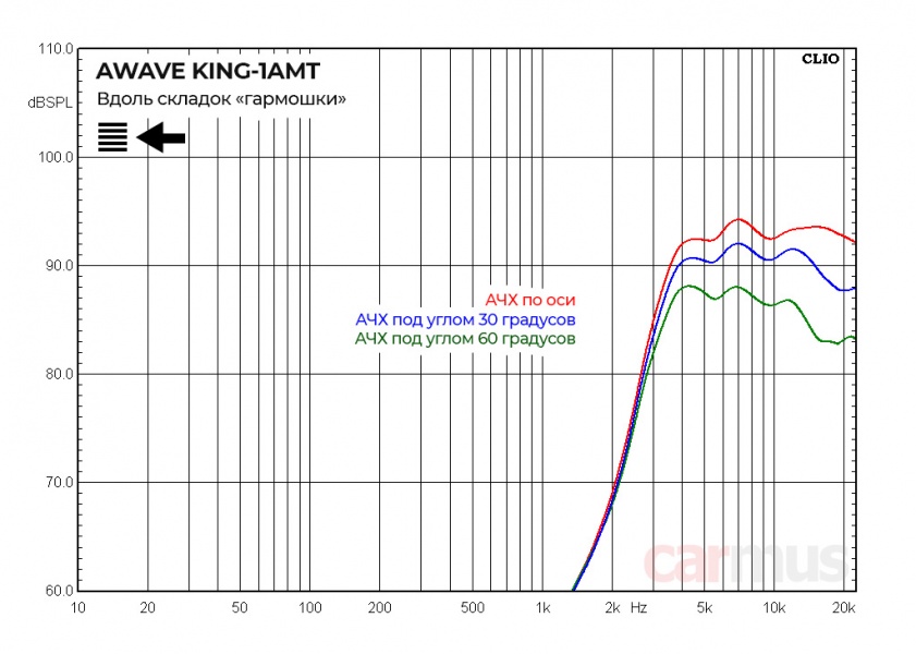 Угловые АЧХ снял в двух положениях твитера – при развороте вдоль «гармошки» и перпендикулярно ей. Впрочем, пропорции твитеров здесь таковы, что разница между ними – практически никакая.