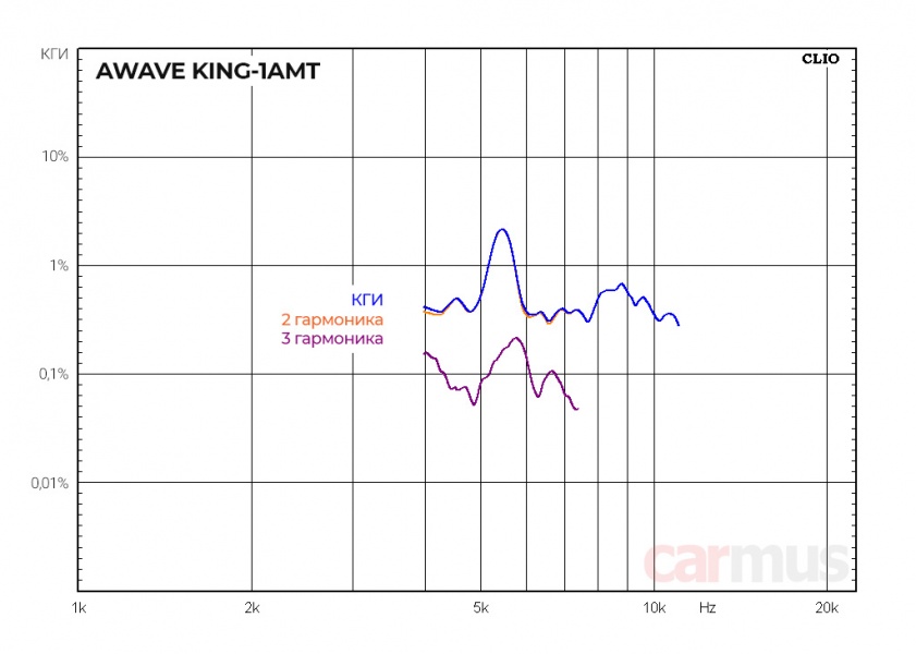 Как это частенько бывает у «хейлов», тут нет выраженного роста искажений с понижением частоты. Однако твитеры сами по себе довольно нежные, так что сильно опускать срез ФВЧ всё же не стоит. Тем более, в районе 5,3-5,5 кГц прослеживается какой-то артефакт, который лучше оставить за пределами рабочего диапазона.