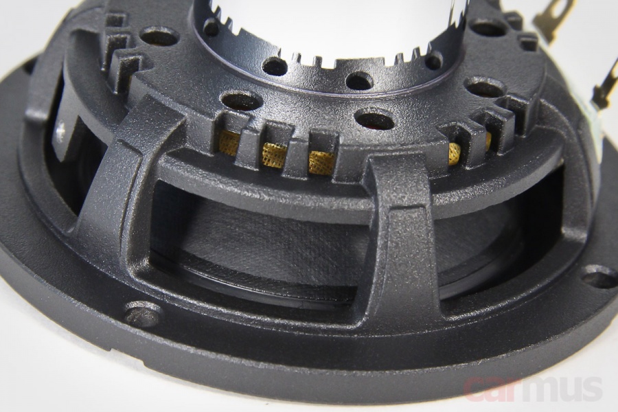 Диффузоры – тонкая, но плотная и жёсткая прессованная целлюлоза. Колпачки – тоже жёсткие, и больше того, из того же материала, что и конусная часть. Верхние подвесы – резиновые, с плавным профилем, достаточно мягкие.