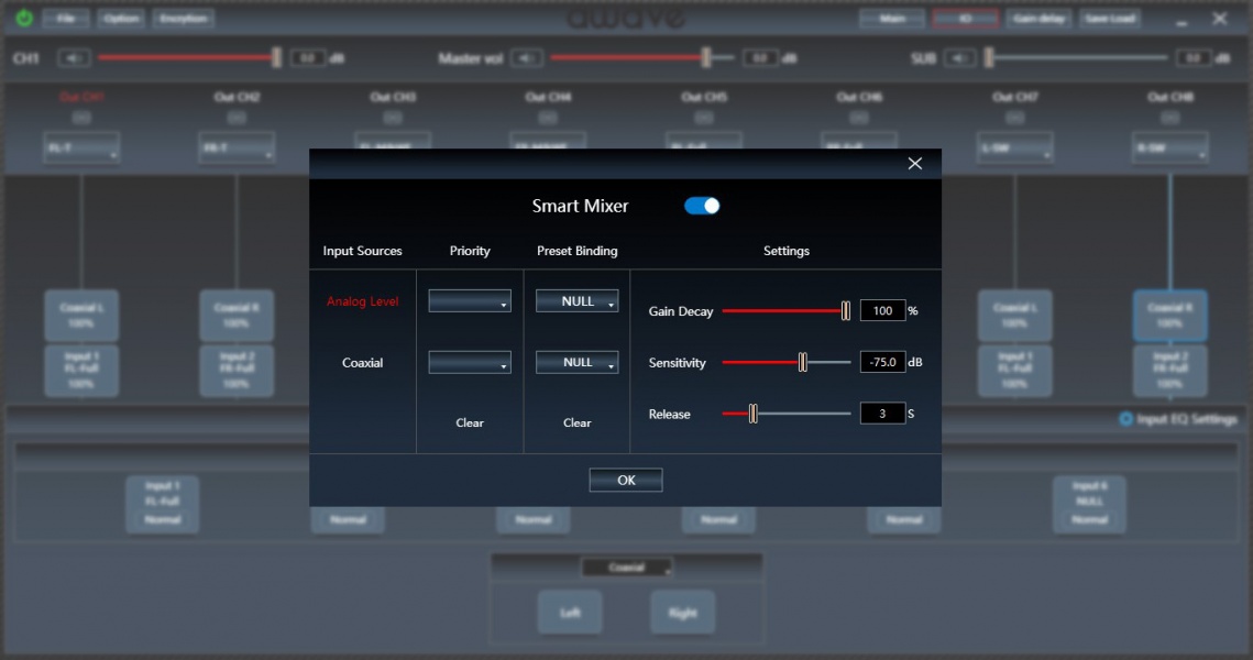 …ещё можно поиграться с временем запуска и выключения усилителя, включить при необходимости пороговое шумопонижение на аналоговом входе (особенно полезно при подмешивании сигнала с него к цифровым источникам)…