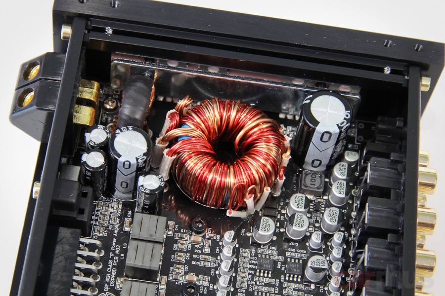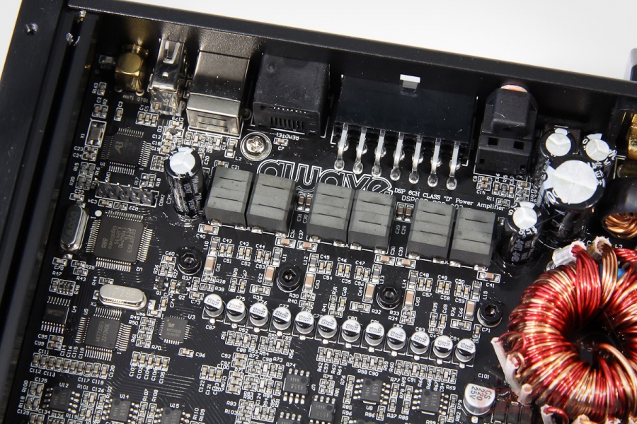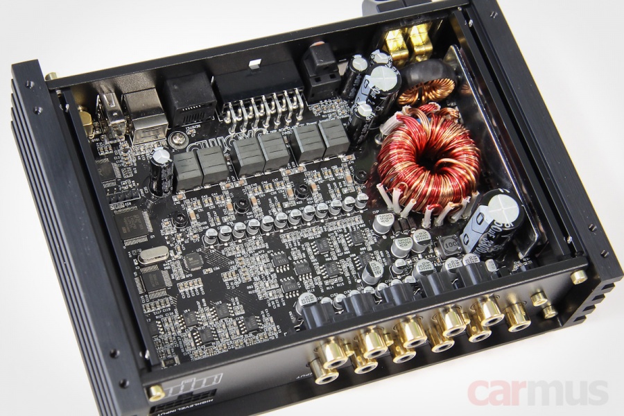 Обычно подобные процессорные усилители построены на «магнитольных» микросхемах АВ класса, здесь же – D-класс с полноценным повышающим блоком питания. Правда, сами чипы скрыты под платой и прижаты к корпусу, поэтому подсмотреть, на чём он собран, не удалось.