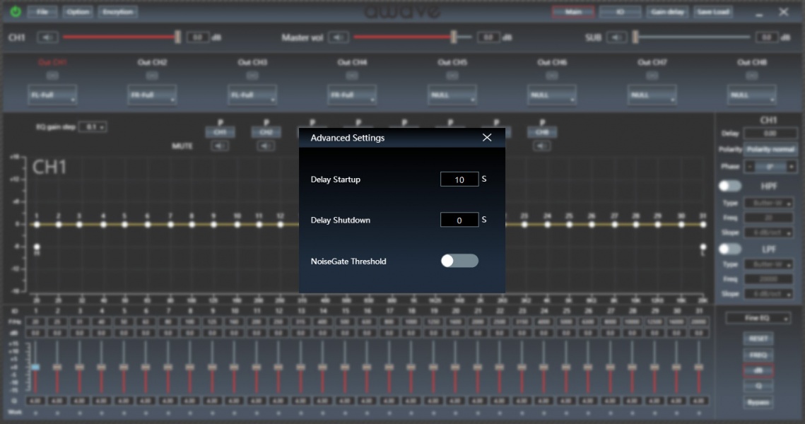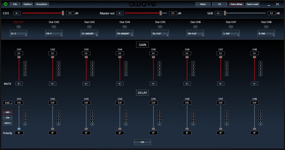 В отдельном окне настраиваются задержки – до 20 мс с шагом на выбор 0,02 мс, 0,05 мс или 0,1 мс. Ну и здесь же уровни в каналах можно чуть подкорректировать.