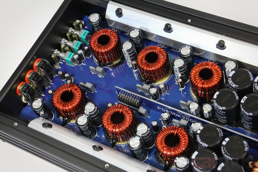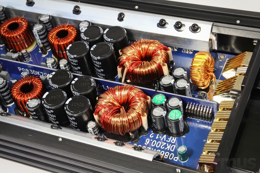 Теперь начинка. Тут тоже многое говорит об акценте на мощности – двойной блок питания, относительно крупные выходные дроссели. Вот только узнать что-нибудь конкретное по элементному составу, не разбирая усилитель полностью, оказалось сложно: многие элементы скрыты под платой.