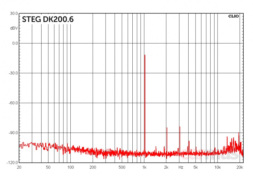 Распределение гармонических искажений по диапазону равномерное – КГИ в пределах одного порядка, сильного повышения на нижних и верхних частотах, как это часто бывает, этот усилитель не допускает.