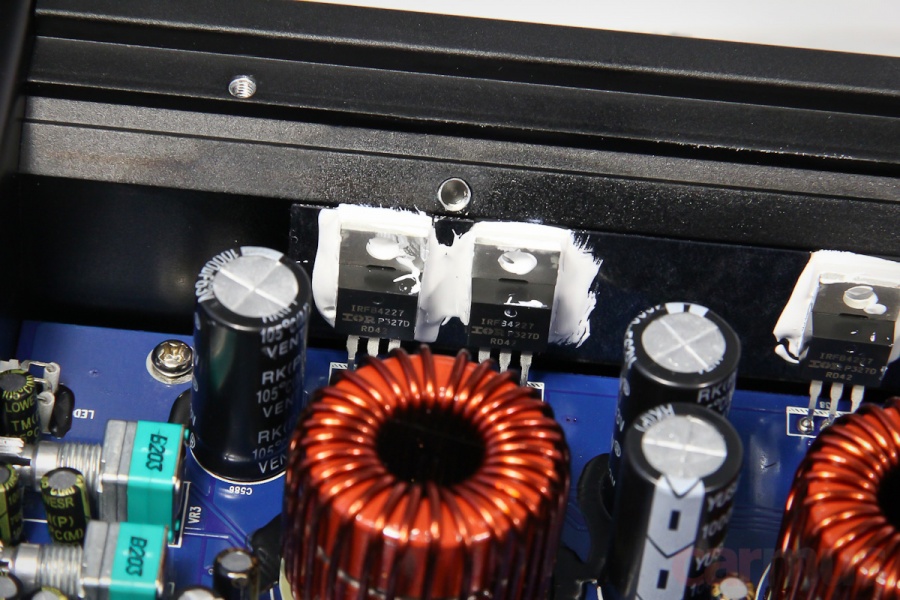 Разве что снял прижимную планку, чтобы увидеть силовые ключи – на выходах здесь трудятся достаточно мощные полевики IRFB4227.